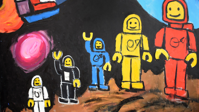 Jonathan has enjoyed the challenge that I like things I remember has been for him. The bigger canvases might seem daunting, but Jonathan has painted murals before so he has approached the task with a plan: “You can really slap a lot of paint into it. But I do a lot of like, rough thumbnail work and it’s not all chaos”.