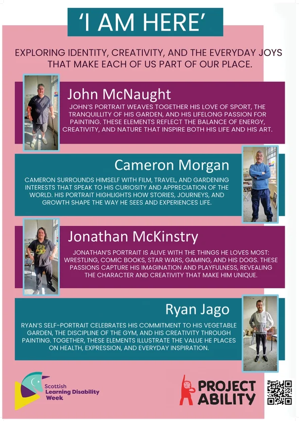 I AM HERE is an exhibition celebrating Scottish Learning Disability Week. Featuring portraits by four Project Ability artists, John McNaughtCameron Morgan, Ryan Jago and Jonathan McKinstry . The exhibition is open to the public, within the Glasgow University’s Byres Road Hub.